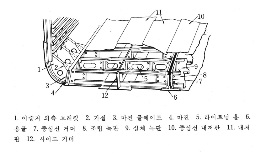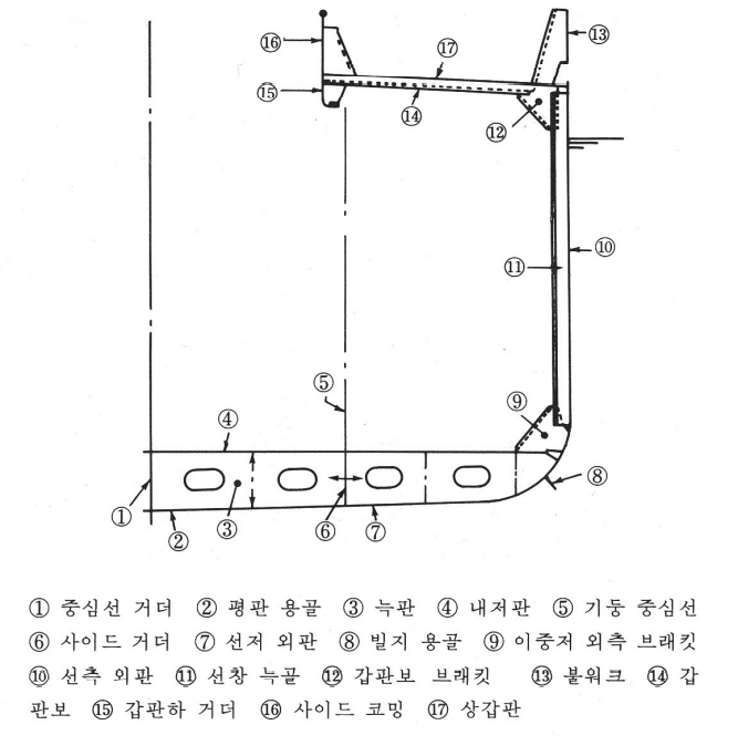 용골(keel)은 선체의 최하부의 중심선에 있는 종강력재로, 선체를 구성하는 기초가 되는 부분이다. 그중 방형 용골은 단면이 장방형이며, 서저의 중앙부에서 돌출하고 있으므로 흘수가 증가하고, 입거 시 손상을 받기 쉬우며 선저 내부 구조와의 연결이 불완전해 종강력이 약한 단점이 있다. 그러나 구조가 간단하고 횡요를 감쇠시키는 역할을 하며 풍압에 의한 압류를 막으며 또한 죄 초시 선저 외판을 보호하는 장점이 있으므로 주로 소형선, 범선 및 어선 등에 채용된다. 평판 용골(flat keel)은 선저 외판의 일부분으로 볼 수 있으며, 선저에 있어 종강력을 분담하는 중요한 재료가 된다. 방형 용골처럼 선저에서 돌출하고 있지 않으므로 횡요 방지의 효과가 없고 선저 보호의 목적에는 부적합하다. 주로 중, 대형선에서 채용한다. 늑골(frame)은 선체의 좌우 선측을 구성하는 뼈대로, 용골에 직각으로 배치되어 선체의 횡강도의 주체가 된다. 이것은 갑판보의 양골을 지지하여 갑판상의 중량을 지탱함과 동시에 수압 등의 외압에 의한 선측 외판의 변형을 막는 역할을 한다. 이중저 구조(double bottom)은 종방향으로 중심선 거더가 용골상을 종통하며, 횡방향으로 늑골의 위치에 늑판을 배치한다. 그리고 외판에는 선저외판을, 내저에는 내저판을 덮고, 다시 내저 빌지 부근에는 마진 플레이트를 덮어 탱크를 수밀 또는 유밀 구조로 한다. 장점으로는 선저부가 손상을 입어도 수밀이 유지되어 안전성이 높아지고, 선저부의 구조를 견고히 해 호깅 및 새깅의 상태도 잘 견딘다. 또한 이중저 내부를 구획하여 밸러스트, 연료 및 청수 탱크로 사용할 수 있고, 탱크의 주·배수로 선박의 중심, 횡경사, 트림 등을 조절할 수 있다.