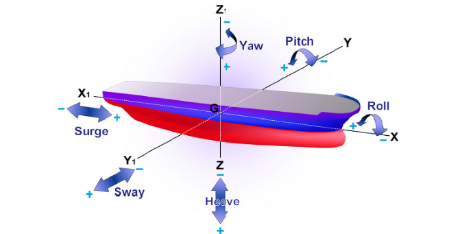 선박에 가해지는 진동은 아래와 같이 3개의 직선운동과 3개의 회전운동으로 구분한다.