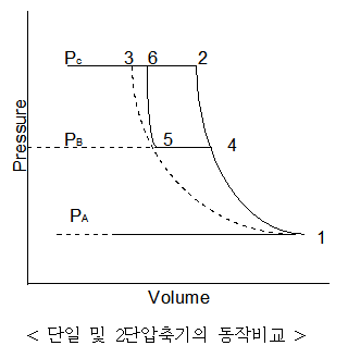 여러 가지 이유로 단일단압축기에 대하여 배출 압력의 흡입 압력에 대한 비에는 제한이 있다. 그 한 가지 이유는 조작 효율에 관계된다. 아래의 그림은 단열(1-2) 및 정온(1-3) 경로에 대한 압축과정을 표시한다. 정온 과정은 넓이 1-2-3에 해당하는 만큼 일이 줄어든다. 피스톤이 움직이는 짧은 시간 동안 다량의 열을 실린더 벽을 통하여 외부로 전달시키는 것은 불가능하므로 실제의 압축과정은 등온보다도 단열에 가깝다. 그럼에도 불구하고 압축 단계를 두 단계로 나눌 수 있다면 부분적으로 등온 조작의 이점을 얻을 수 있다. 즉 첫 번 압축기 실린더에서 배출 압력을 P(B)로 하고 중간 냉각기에서 처음의 온도 T1까지 기체를 냉각하고 (이 과정은 거의 정압에서 일어난다. 경로 4-5), 끝으로 둘째 실린더에서 압력을 P(C)까지 압축한다. 이 두 단계의 계에 있어서는 넓이 2-4-5-6에 같은 일의 갑소가 이루어진다. 단수를 셋 또는 그 이상으로 증가시킴으로써 소요일량은 더욱 감소시킬 수 있을 것이다. 따라서 동력비의 감소와 장치 값의 증가하는 투자가 서로 평형되는 점이 있을 것이다. 실제로 사용되는 단수는 주로 전체 압력차와 용량에 관계된다. 큰 기계에서는 한단에서의 압력 비가5 또는 6을 넘는 일은 드물며 이보다 작을 것이다. 작은 압축기에 있어서는 동력비는 그다지 중요하지 않으므로 이 비는 비교적 클 것이다.