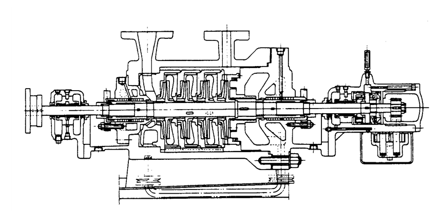 날개바퀴는 1방향으로 향해 배열되고 최종단의 뒤에 밸런스피스톤을 설치하여 축방향의 추력을 균형 잡히게 하고 있다. 이 형식의 것은 보통 슬리이브형의 래디얼베어링 및 패트형의 스러스트 베어링을 사용하여 강압 주유의 윤활 방식이 채용된다. 축봉에 직결된 윤활유 펌프로 주유되지만 구동기의 윤활을 포함하여 별도의 주유 펌프에 의해 집중윤활방식으로 할 때도 있다. 또한 소형의 압력이 낮을 경우는 축받이에 보올 베어링을 사용할 수 있다. 내압부가 원통형이기 때문에 온도변화 및 고압에 대해서 변형이 균등하므로 가혹한 운전에 대해 안정성이 크다. 이 형식에 있어서 밸런스피스톤과 디스크의 조합에 의해 축방향 추력을 균형시키고 스러스트 베어링을 갖지 않는 구조의 것이 있으나 화학플랜트용에는 거의 채용되지 않는다. 외부 케이싱에 흡입노즐 및 토출 노즐이 설치돼 있으므로 배관의 접속을 떼내지 않고도 펌프를 분해할 수 있으나 내부 케이스와 회전체를 일괄해서 축방향으로 빼내야 하므로 이에 상당한 간격을 둘 필요가 있다. 또 낮은 NPSH가 요구될 경우에는 1단날개바퀴만을 양흡입형으로 한 것이 쓰인다.