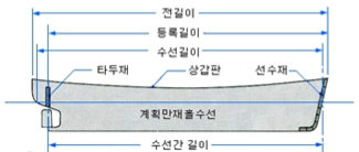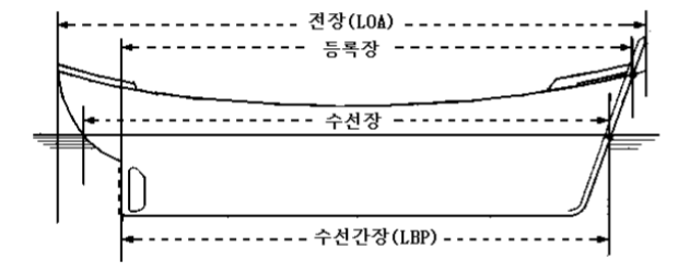 선박의 길이에는 위 사진과 같이 전장, 수선간 길이(수선간장), 수선 길이(수선장), 등록 길이(등록장), 건현용 길이 등등이 있다. 전장은 전체 길이를 말하며, 선박의 맨 앞쪽에서 맨 뒤쪽까지의 수평거리로 선체에 고정적으로 부속된 모든 돌출물을 포함한다. 이 길이는 안벽계류(붙잡아 매워 놓음) 또는 입거시 사용되는 길이이다. 수선간 길이(수선간장)는 선수 수선(만재흘수선과 선수재의 전면이 만나는 점)과 수미 수선(만재흘수선과 타주의 후면이 만나는 곳에서 수직선, 타주가 없는 경우 타두재의 중심선과 만나는 곳에서 수직선) 사이의 수평거리를 말한다. 순양함형 선미를 가진 선박은 선미의 돌출부가 길어서, 만재 흘수선상의 수선길이의 96%와 수선간 길이를 비교해 긴 쪽을 수선간장으로 정한다. 보통 수선간의 길이(수선간장)은 수선길이(수선장)의 98%정도 이다. 수선길이는 만재흘수선에서 선수의 전장으로부터 선미의 후단까지의 수평 거리를 말한다. 등록 길이는 선박 법규에 따라 선박 원부에 등록하는 길이이며, 상갑판 보의 상면의 연장선과 선수재 전면과의 만나는 점에서 선미재 후면에 이르는 수평거리를 말한다.